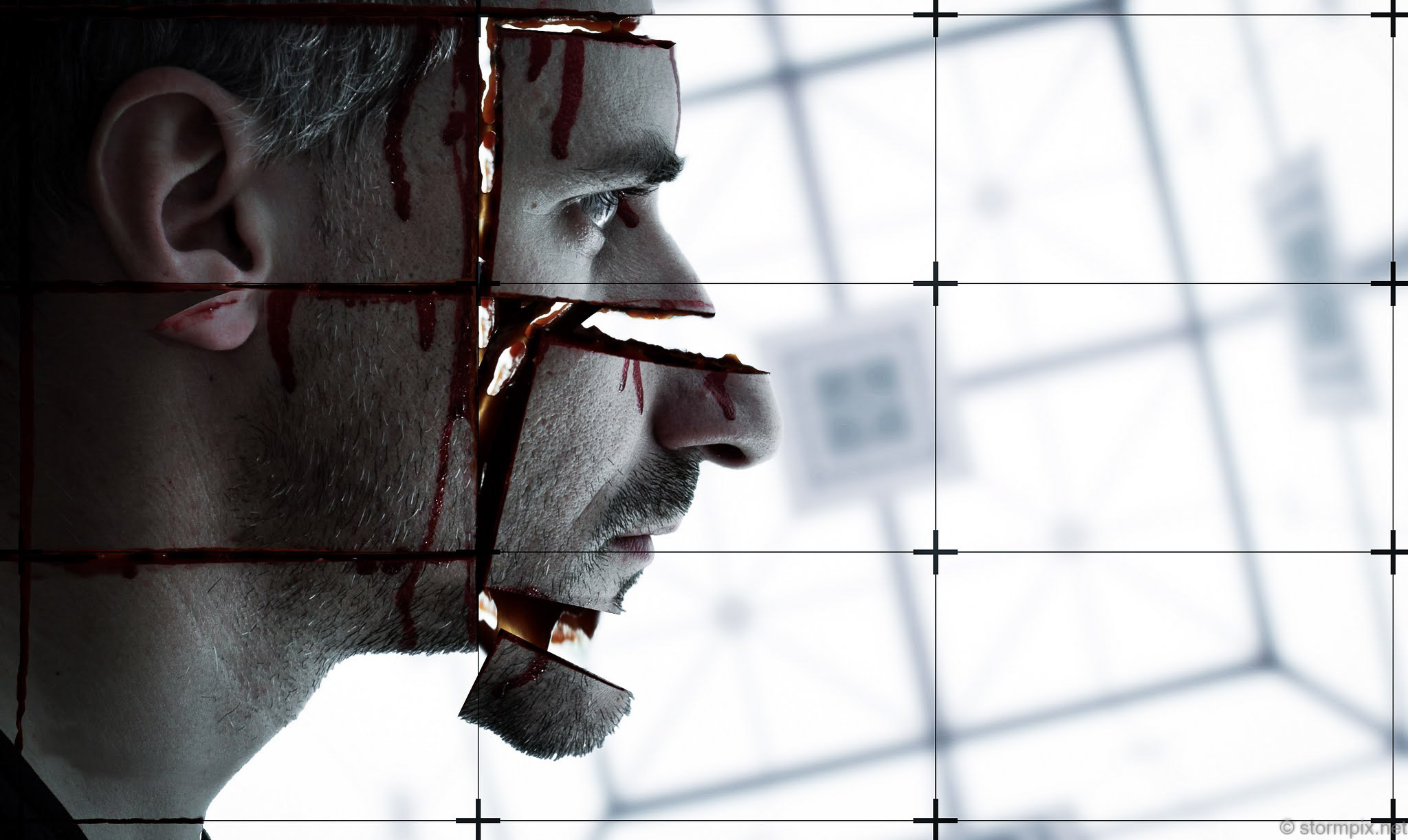 To verify the concept I did a quick mock/prototype image in Snapseed/Sketchbook to see if the concept would look convincing at all. That's what you see in the first image. The Image was taken at the busstop with the tablet's camera, blood is hand painted. Looks ugly but convinced me that it could work. It also showed that if I overlayed the crop grid, the blood didn't need to be too accurate,